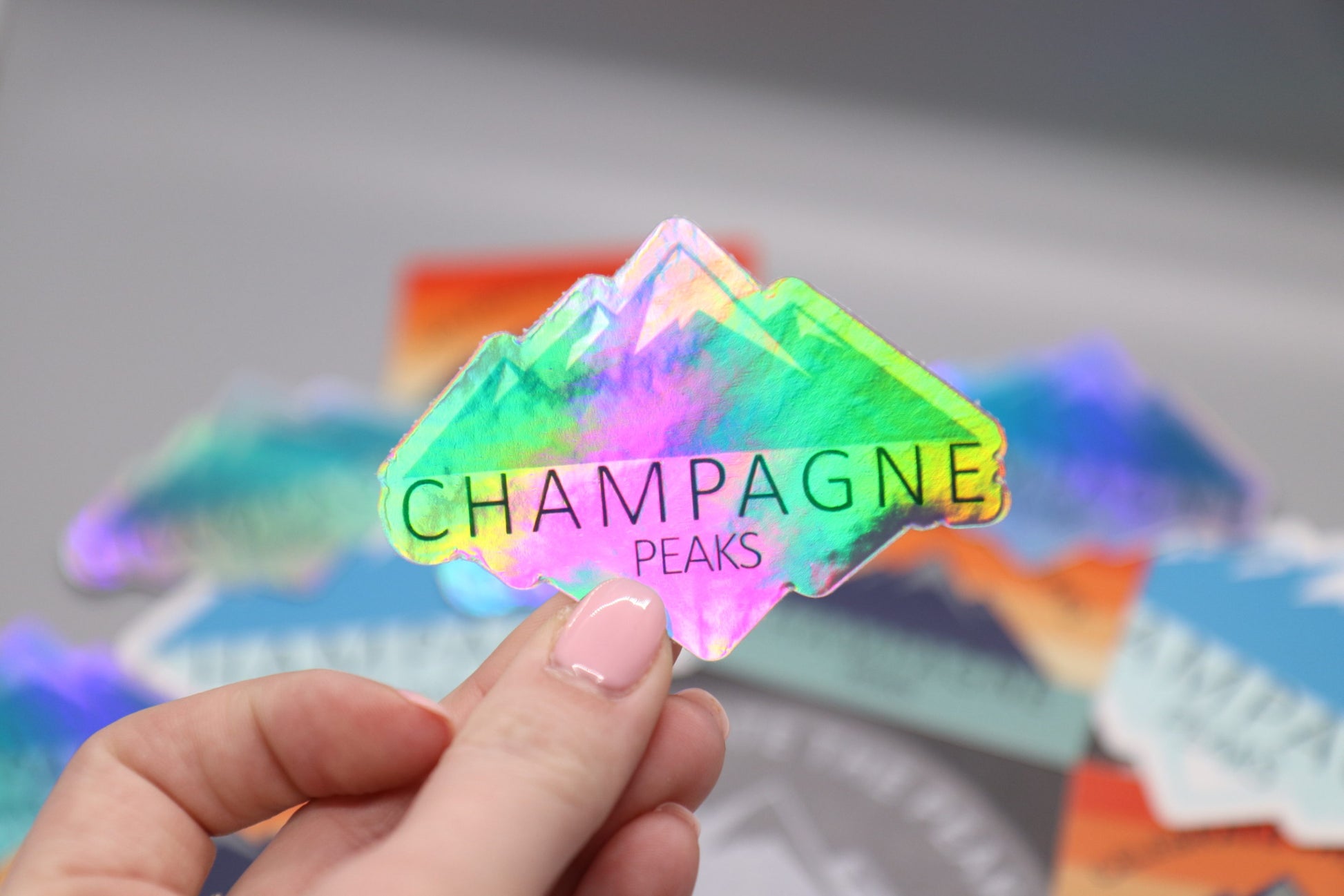 Champagne Peaks logo holographic sticker. Our vinyl sticker is perfect for your water bottle or the back of your phone!